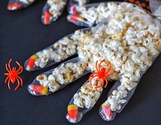 We LOVE this spooktacular snack from Yummy Healthy Easy. With disposable food contact gloves, popcorn and candy corn, you can create a fabulous after school snack, party favor or trick-or-treat item for Halloween night!