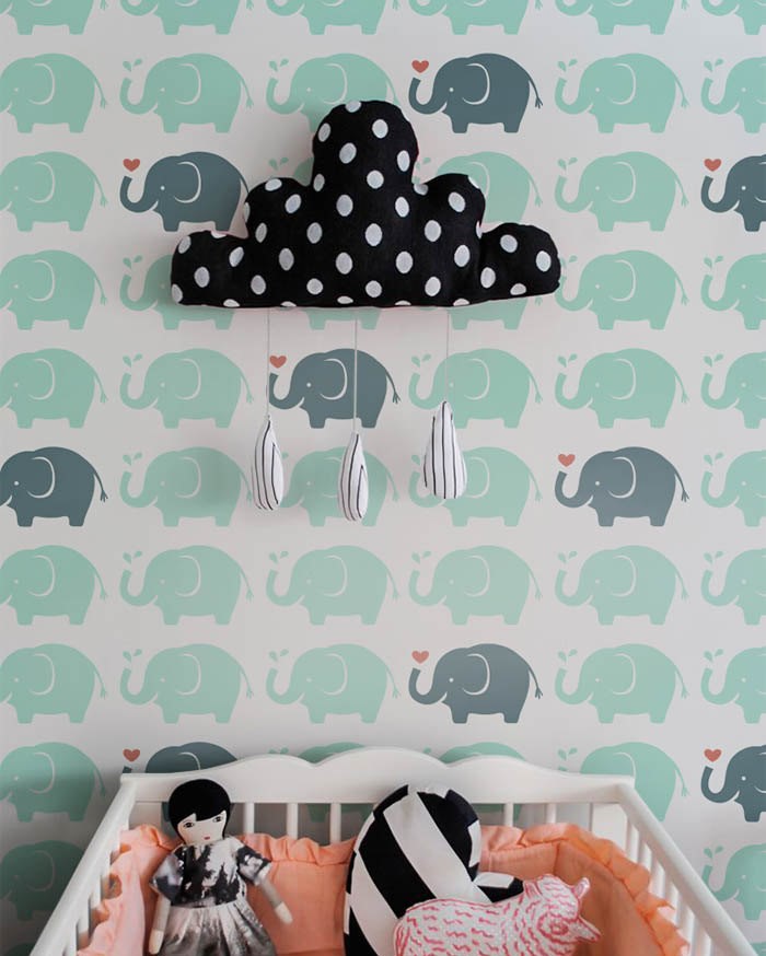 The Olivia Design on Etsy has created an adorable mint green and gray elephant wallpaper that’s perfect for the nursery — we love the color combo with our sweet little guy!