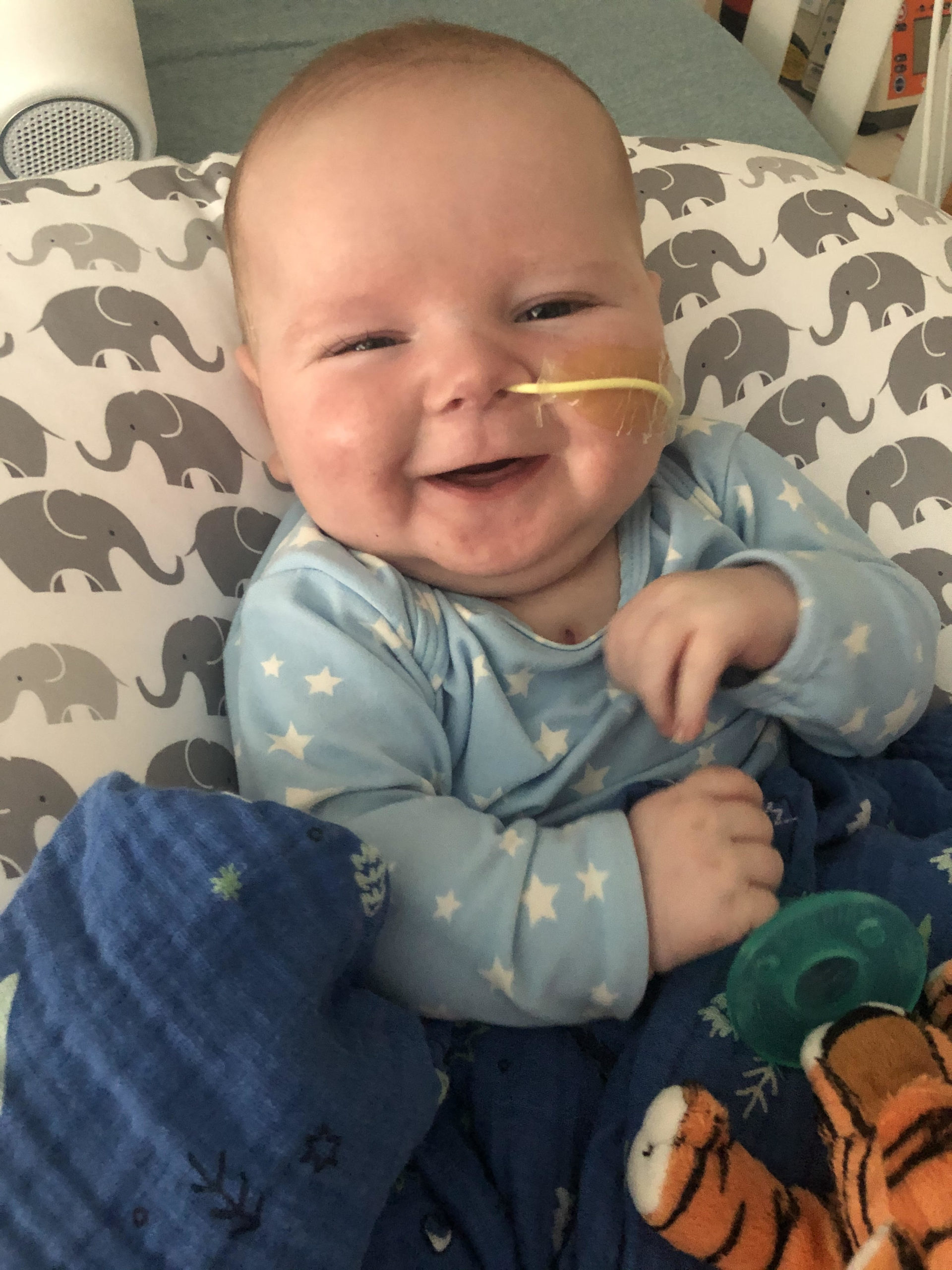 As we adjusted to home life, we began to slowly see his oxygen saturation dip which led us to go back to Boston about 5 weeks later. On our second trip back to Boston, we planned for a quick visit – a routine cath procedure to enlarge the stent in Oliver’s heart and determine if another stent (RVOT) would be placed. Oliver successfully came out of the procedure with an RVOT stent and a dilated PDA stent. He was recovering well and was extubated that night. We left the hospital knowing that our son was in the best of hands and we headed to bed ourselves after a stressful day.